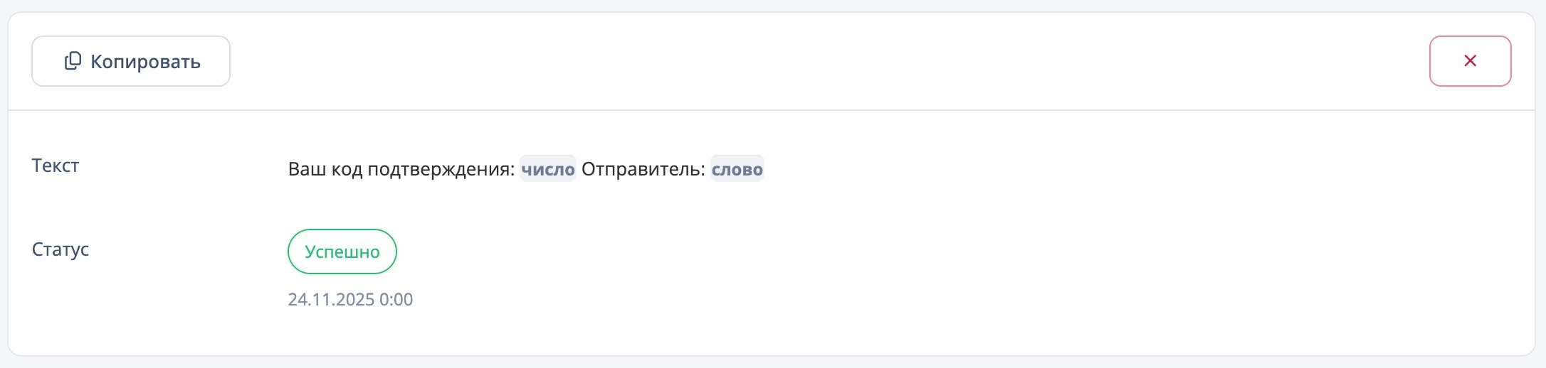 Ваш код подтверждения: ЧИСЛО Отправитель: СЛОВО