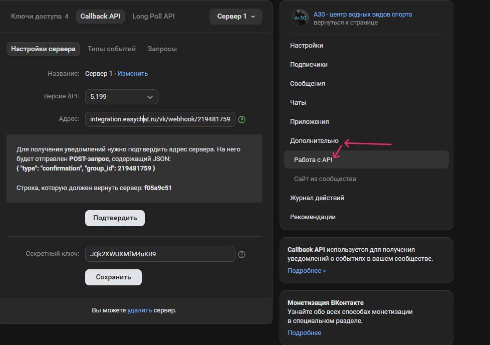 3. После успешного сохранения в форме появятся поля "Секретный ключ" и "Callback API Адрес".