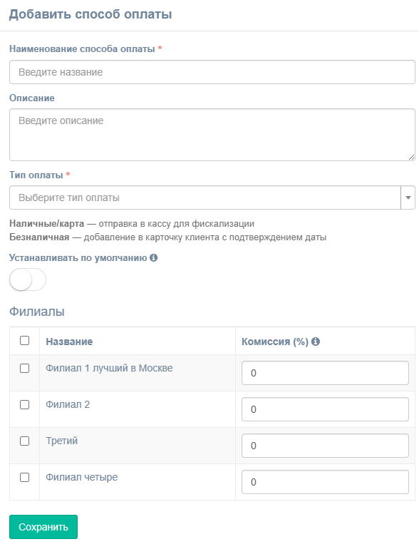 | Настройка по филиалам | Общие для всей сети. | Гибкая. Для каждого филиала можно включить/выключить способ и задать свою комиссию. |