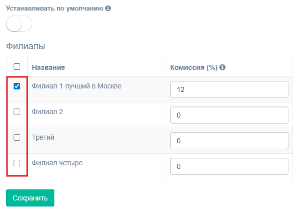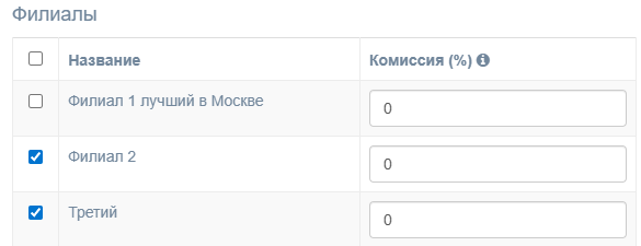 6. В таблице филиалов поставьте галочки там, где этот способ будет доступен, и укажите в соседнем столбце размер комиссии.